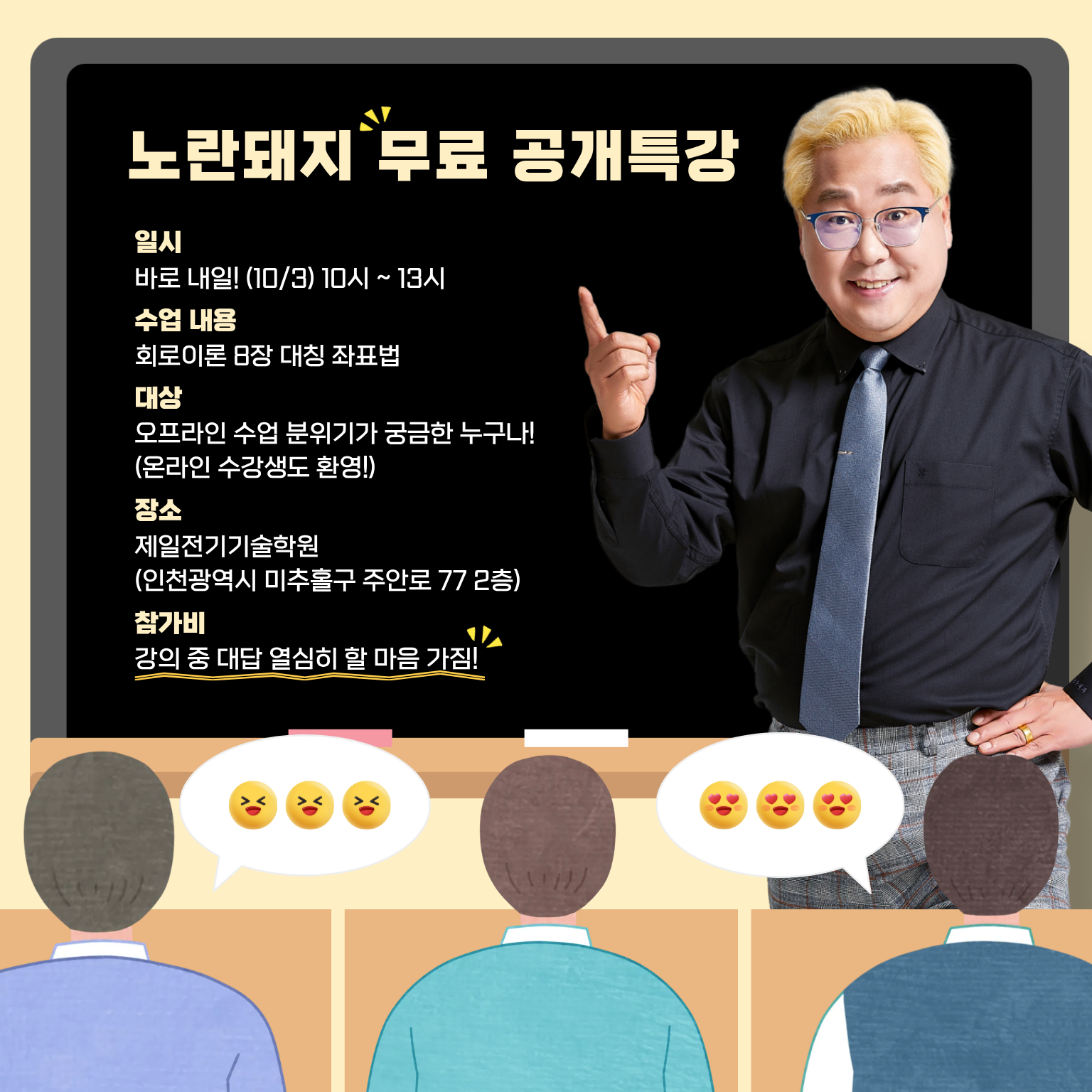 안녕하세요, 노란돼지합격사단입니다 :) 내일(10월 3일 금요일), 노란돼지 원장님의 무료 공개특강이 진행됩니다. 오프라인 수업의 생생한 분위기를 직접 경험해볼 수 있는 특별한 자리에 여러분을 초대합니다😆